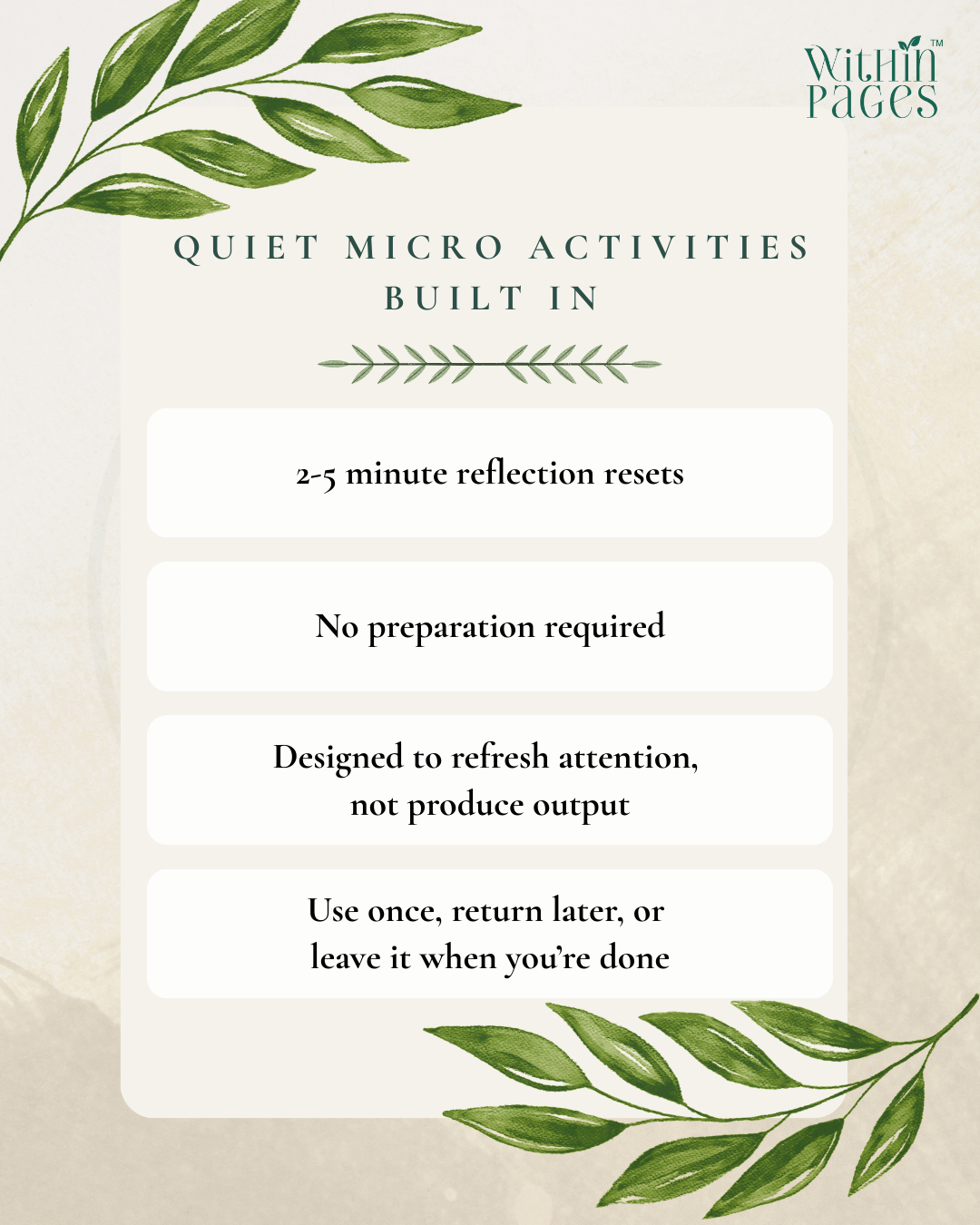 - Quiet micro-activities woven throughout to help reset attention, ease mental load, and regain clarity in short moments.